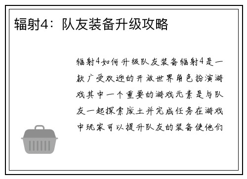 辐射4如何增强伤害 辐射4是一款受欢迎的开放世界角色扮演游戏,玩家在游戏中需要面对各种敌对生物和敌人。为了在游戏中更好地生存和战斗,增强伤害是非常重要的。本文将从多个方面详细阐述如何增强伤害,帮助玩家...